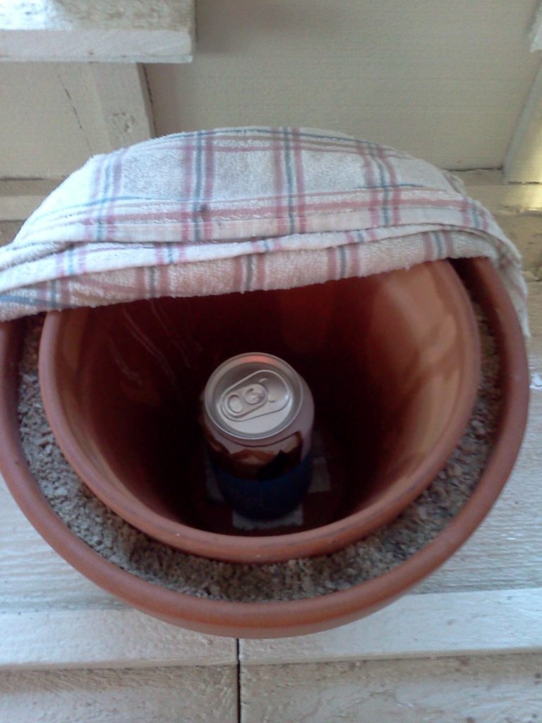The one downside to the pot-in-pot refrigerator is it works best in dry air, preferably with a breeze to aid in evaporating the water. Humidity levels over about 50% make the water evaporate more slowly, thus limiting the evaporative cooling effect. But on a hot dry summer day, during a power outage or other emergency, or camping or if you’re into sustainable living, this is an excellent way of keeping your perishables longer or just cooling your beverages.